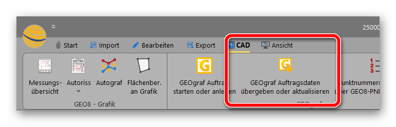- Übergabe von Auftragsdaten an GEOgraf®: Auf der Reiterkarte „CAD“ finden Sie einen neuen Button „Auftragsdaten an GEOgraf® übergeben oder aktualisieren“. Mit dieser neuen Funktion, übergeben Sie die in den GEO8 Abschnittseigenschaften enthaltenen Auftragsdaten an GEOgraf®, die dann wiederrum als Plotvariablen verwendet werden können.