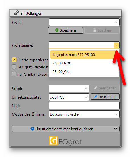 Abhängig von der Auftragsart, die von GEORG an GEO8 übergeben wird, lassen sich Projektnamen definieren und innerhalb des GEOgraf®-Exportdialogs auswählen.