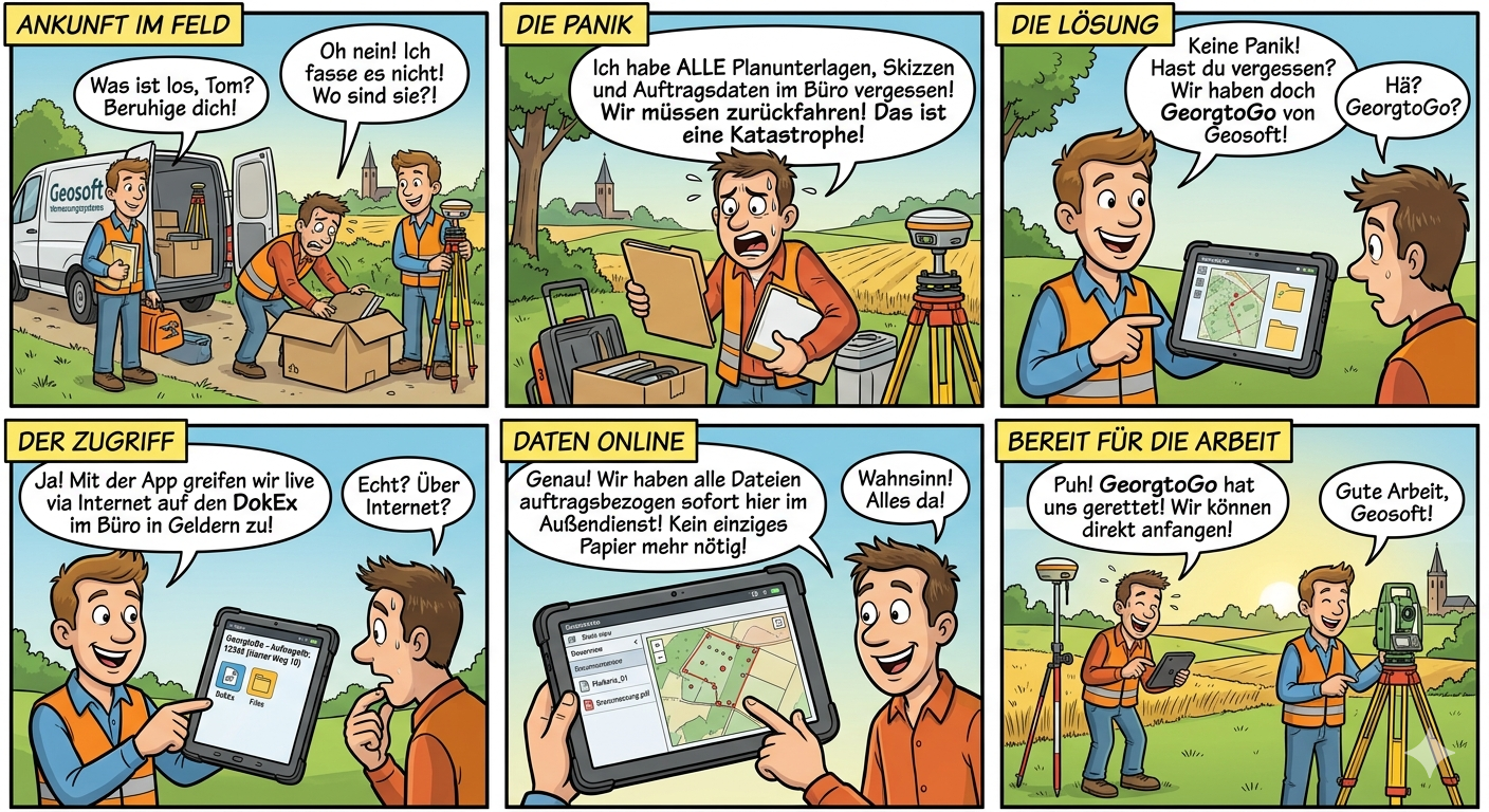 Nichts beschreibt das Szenario im Außendienst vergessener Unterlagen, Risse, Karten oder Kontaktdaten so gut wie das angehängte Comic. Und genau deshalb sollten Sie das Außendienstbüro GEORG toGo immer dabei haben, damit Sie stets arbeitsfähig bleiben.