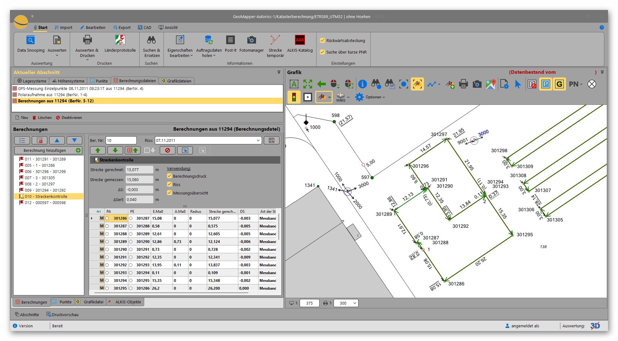 Mit dem Modul Autoriss können GEO8-Berechnungsdaten automatisch in grafische Informationen für GEOmapper oder GEOgraf® konvertiert werden. Dazu werden zunächst in gewohnter Weise die Berechnungen mit GEO8 ausgeführt. Die Berechnungsdateien werden z.B. in GNSS-Symbole, Standpunktsymbole, Beobachtungspfeile, Fehlervektoren, Linienverbindungen und Texte umgesetzt.