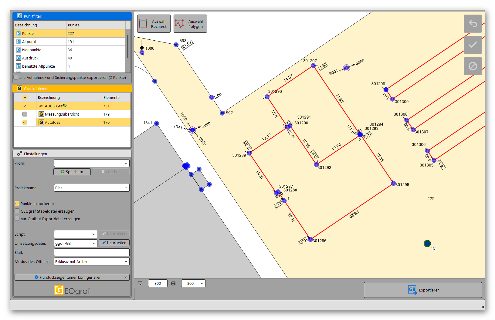 - Erweiterung um eine grafische Auswahl und somit eine Angleichung an unseren Standard-Exportdialog, wie er auch bei den Schnittstellen zu GEOmobile 2 / LT, GEOmapper oder ASCII zu finden ist.