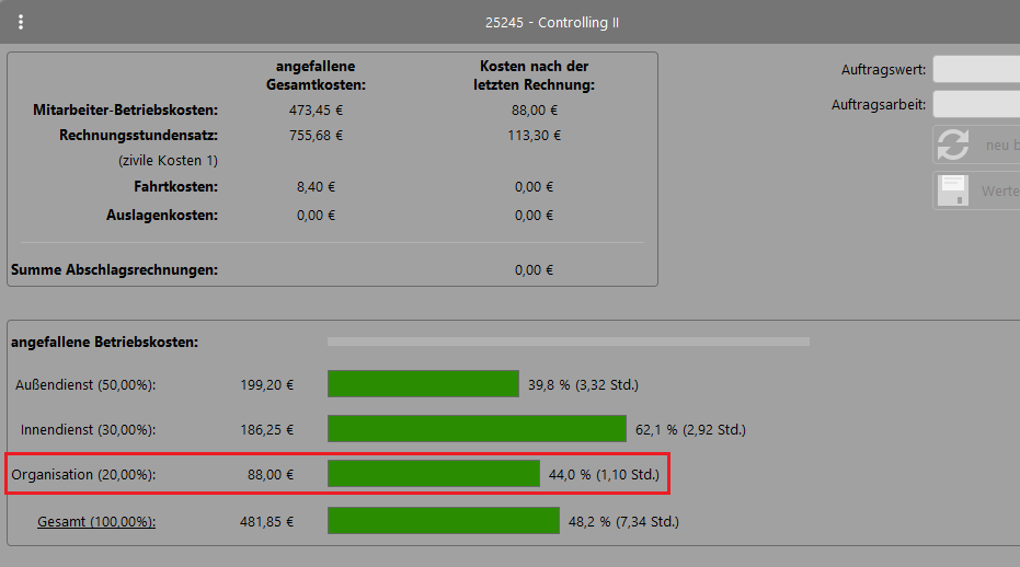Im Controlling II - Fenster waren die Kategorien Organisation und Innendienst vereinigt.