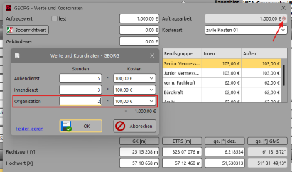 Die prozentualen Anteile werden wie gewohnt den Auftragsarten zugewiesen. Bei Abweichungen kann man unter dem Menüpunkt Werte eigene Kostenverhältnisse definieren. Hierbei wurde die Option auch um den Punkt Organisation erweitert.