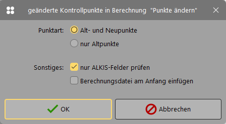 Ist die Option "nur ALKIS-Felder prüfen" aktiv, werden die Eigenschaften Messdatum, Sachdaten und Fotos zukünftig nicht berücksichtigt.
