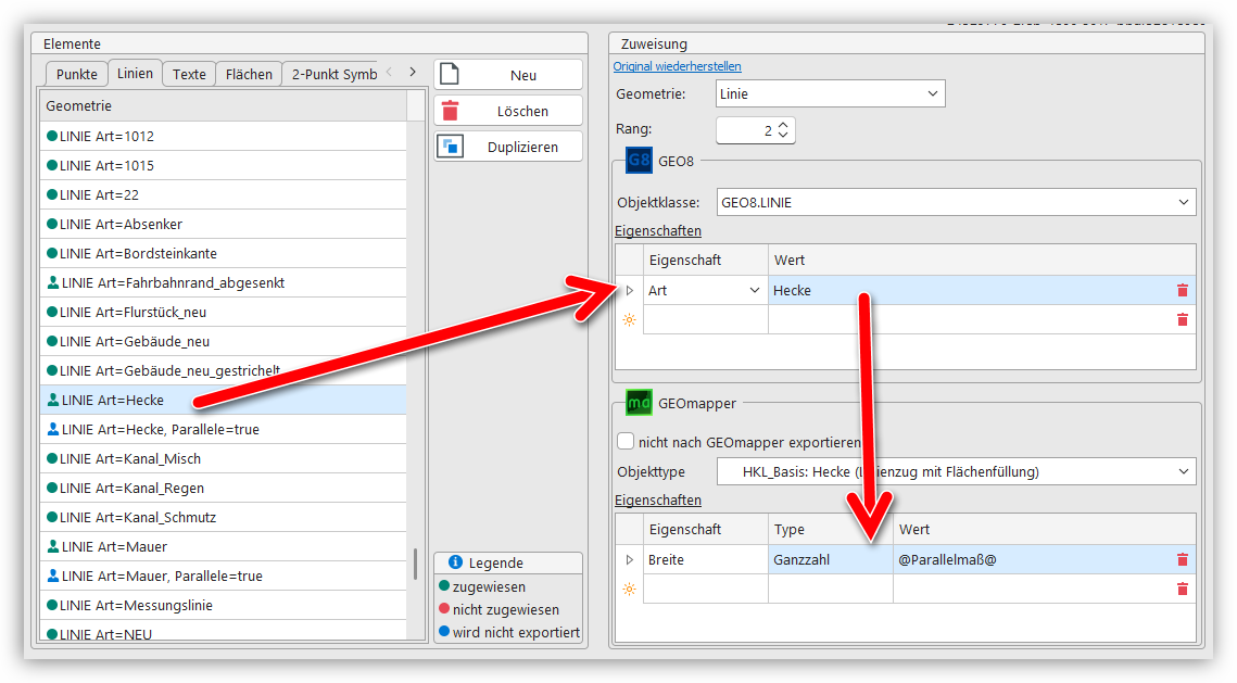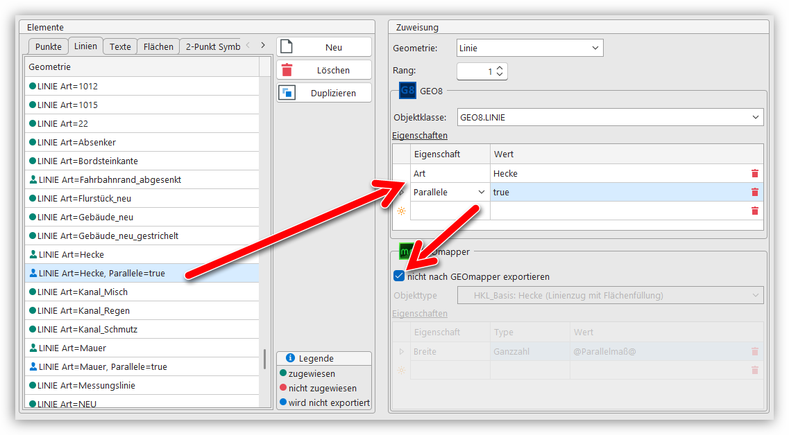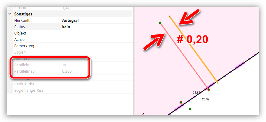 Linien, die in GEOmobile 2 mit einem Parallelmaß aufgenommen wurden, erhalten durch das GEO8 Modul Autograf automatisch eine parallele Linie. Ab dieser GEO8 Version wird das Parallelmaß und die Information, ob es sich um eine Parallele handelt in den Eigenschaften der GEO8 eigenen Linien gespeichert.